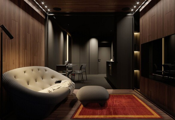 Modern living rooms with minimal furniture , generally are gathered in a square shape , with two L-shaped sofas.