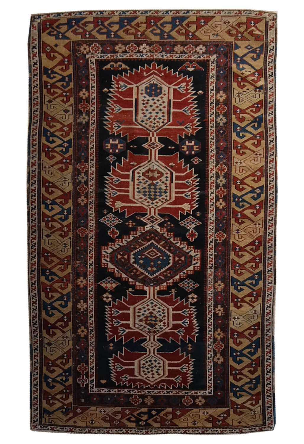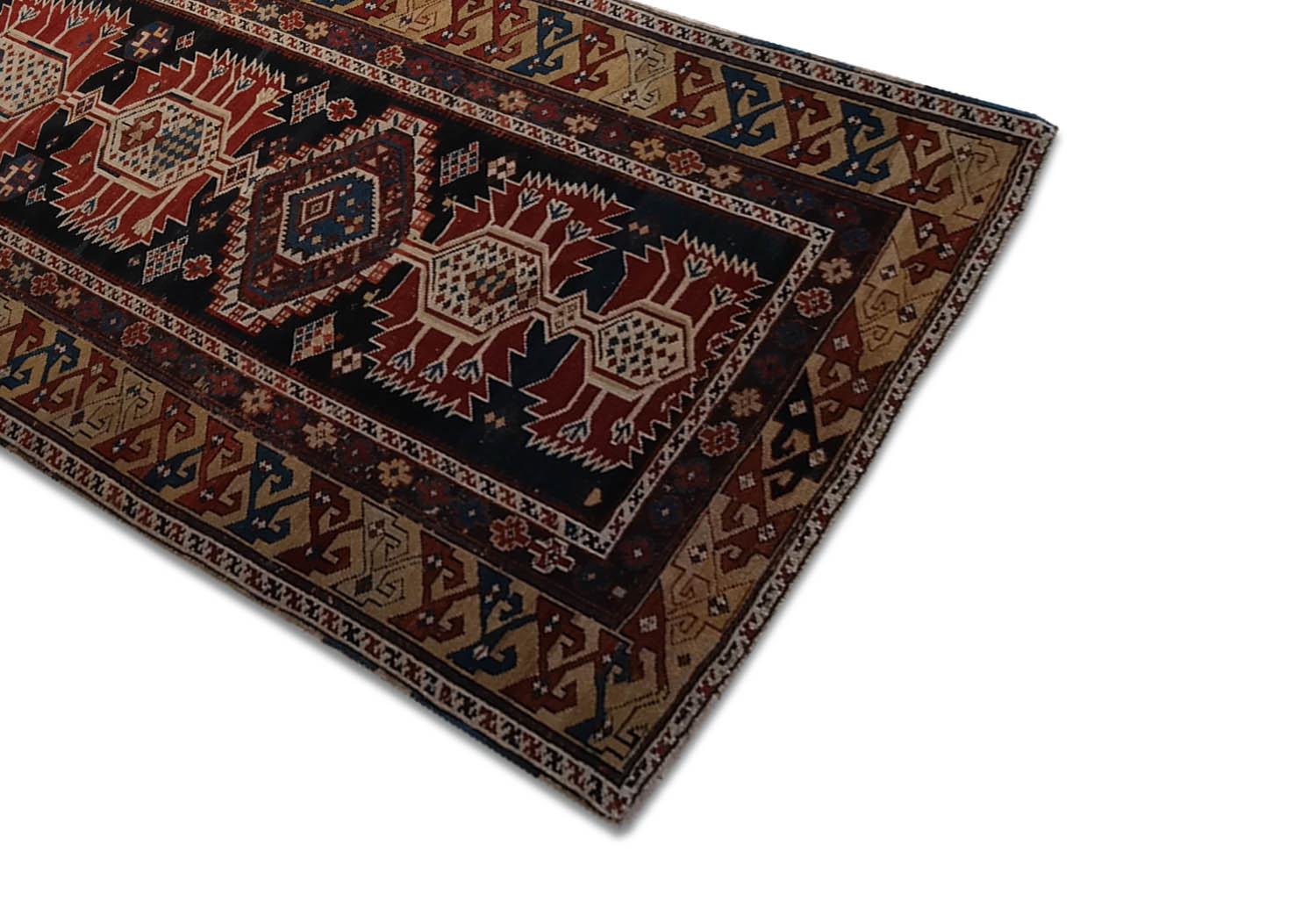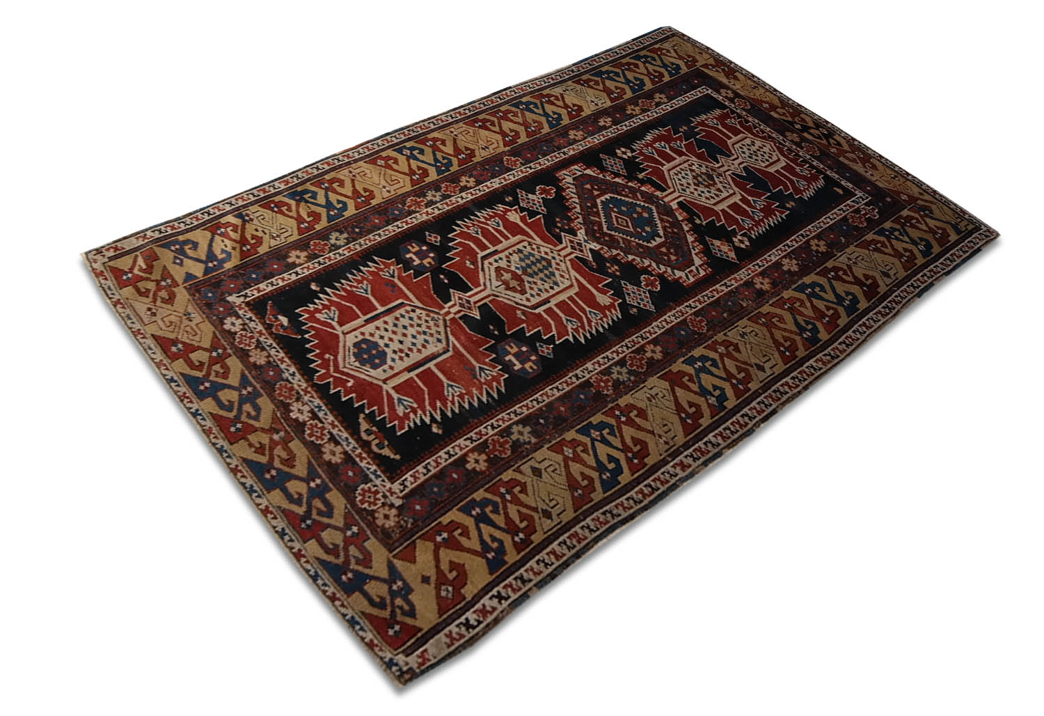 The antique Caucasian Kuba rug is a piece of great charm and historical value, prized by collectors and lovers of fine furnishings. Hailing from the East Caucasus region, now part of Azerbaijan, this carpet represents one of the most authentic expressions of the 19th-century Caucasian textile tradition. The Kuba are distinguished by bold geometric patterns, large central medallions and borders embellished with hooked decorations, symbols of protection and prosperity. Natural colors, derived from plant dyes such as indigo, madder and pomegranate, give the rug a timeless vibrancy: brick red, deep blue, ivory and touches of light blue combine in perfect balance. Made of hand-knotted wool on quality warp and weft, the Kuba is not just a furnishing accessory but a true collector’s item. Perfect for enhancing modern and classic settings, this rug combines art, history and tradition in one unparalleled textile work.