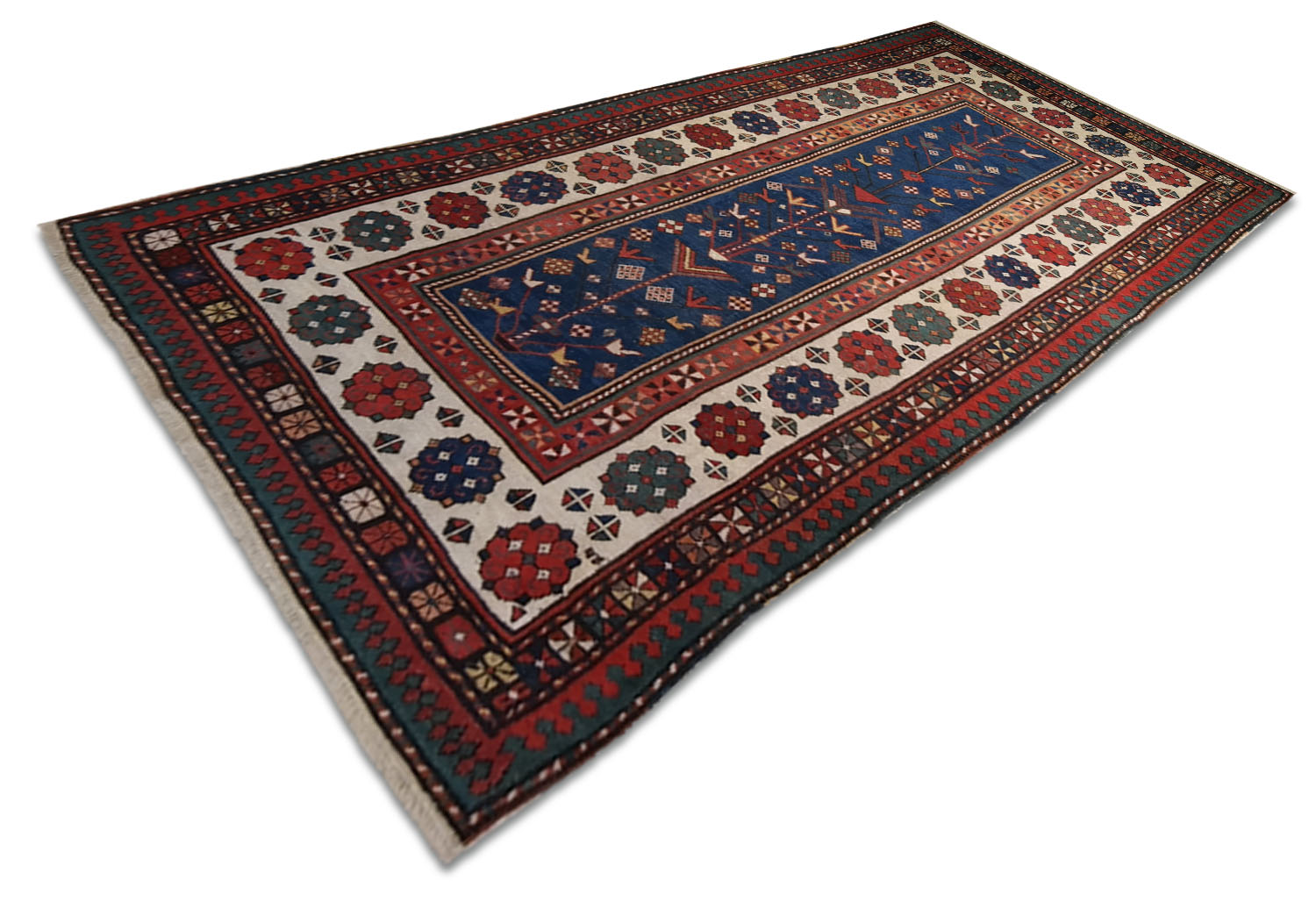 The central field, with a deep blue background, is dominated by a large vertical motif related to the theme of the tree of life, represented in a highly stylized and geometric form. Angular branches, rhomboid elements, small birds, and protective symbols develop along a well-marked central axis, creating a strong sense of verticality and sacredness. This type of iconography is typical of antique Caucasian rugs, where symbolism played a fundamental role.