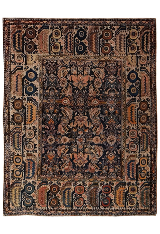 The central field, set on a dark blue-black background, is densely decorated with stylized geometric and floral motifs, symmetrically arranged along the vertical axis. Rosettes, lozenges, and angular figures alternate, creating a strong and dynamic visual rhythm typical of Caucasian rugs. The absence of a classic central medallion reinforces the primitive and graphic character of the ensemble.