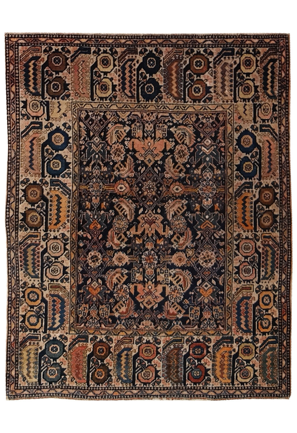 The border is one of the most distinctive elements: composed of a sequence of repeated rectangular panels, decorated with rosettes, zig-zags, and hook motifs, it frames the field with great decorative strength. The colors, warm and earthy, range from ochre to rust, from brown to dark blue, with ivory accents, all obtained from natural dyes now beautifully matured.