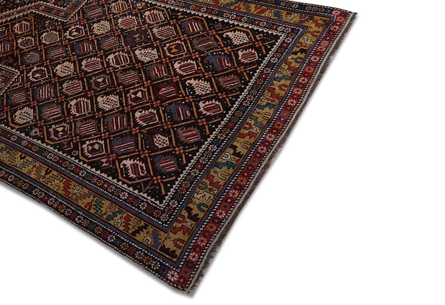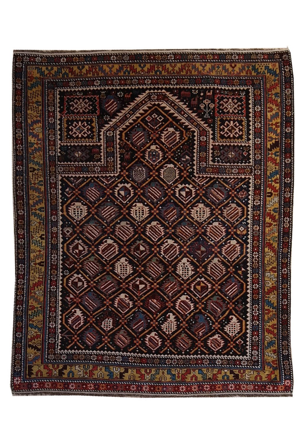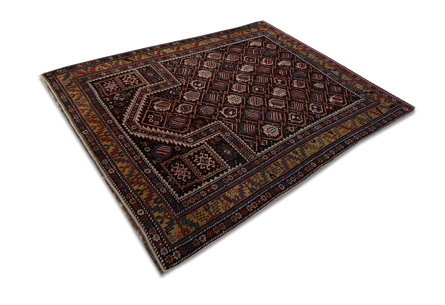 The Ancient Caucasian Shirvan rug is one of the most sought-after artifacts by connoisseurs of textile art. Made in the East Caucasus in the late 19th and early 20th centuries, this carpet is distinguished by the presence of the mihrab, the stylized arch indicating the direction of Mecca, making it an authentic prayer rug. The central field is decorated by a dense sequence of geometric rhombuses, each embellished with symbolic motifs reflecting millennia-old traditions of protection and spirituality. The natural colors, obtained from ancient plant dyeing techniques, offer a harmony of dark blues, reds, ivory and touches of green, maintaining a brilliance that stands the test of time. Hand-knotted in fine wool, this Shirvan represents a perfect balance of technical sophistication and cultural value. Ideal for enhancing elegant spaces and exclusive collections, the Caucasian prayer rug is a unique testament to art, faith and tradition.