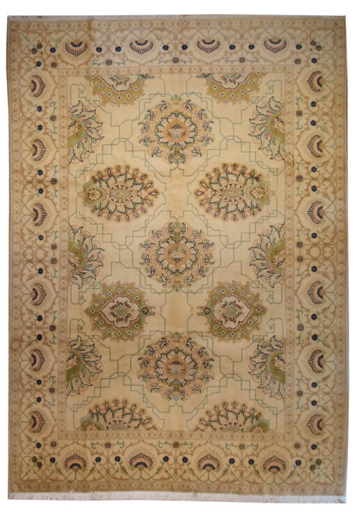 The particular color of light beige and light green shades makes sure that the carpet , kashan knotted Persian becomes a rare piece of its kind .