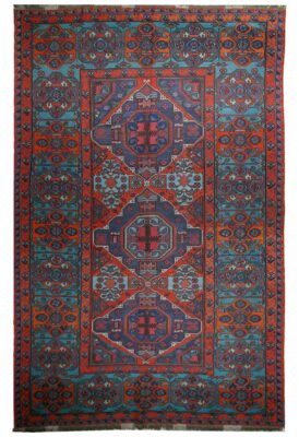 Antique Sumak rug with colors ranging from blue to light blue on a red base, geometric pattern with central medallions .